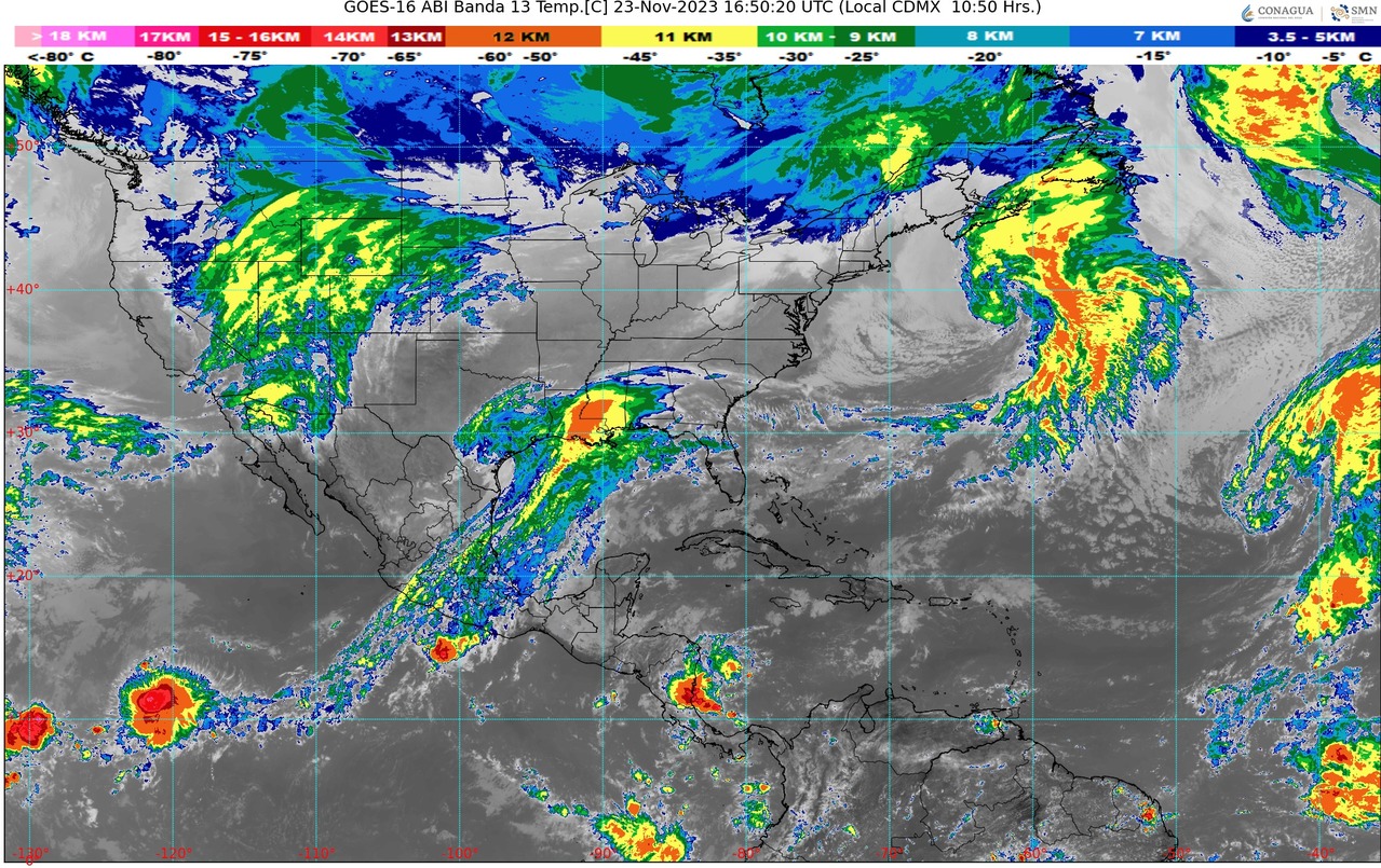CDMX, 23 de noviembre del 2023.- Este día jueves, el frente Núm. 11 se extenderá con características de estacionario sobre el sur del Golfo de México y la Península de Yucatán, en interacción con una baja presión en la Sonda de Campeche y con un canal de baja presión en el sureste mexicano, producirán lluvias puntuales muy fuertes en Tabasco y Chiapas; así como chubascos en Oaxaca, Veracruz, Campeche, Yucatán y Quintana Roo.