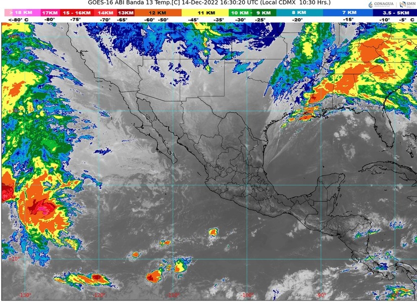 CDMX, 14 de diciembre del 2022.- Este día miércoles, el frente frío Núm. 16 se desplazará sobre el noreste y oriente de la República Mexicana, en interacción con un canal de baja presión sobre el sur del Golfo de México, originarán lluvias puntuales fuertes en las sierras de Puebla, Veracruz y Oaxaca; así como chubascos en el noreste, oriente, sureste y Península de Yucatán.