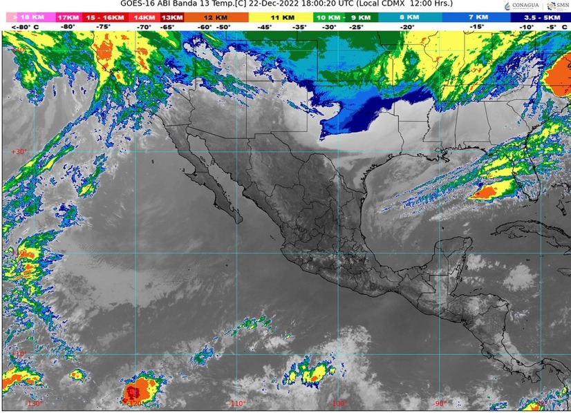 CDMX, 22 de diciembre del 2022.- Este día jueves, un nuevo frente frío (Núm. 19) y su masa de aire ártica asociada ingresarán sobre el norte del territorio nacional durante la tarde-noche, se desplazará rápidamente por el norte y noreste de la República Mexicana, produciendo intervalos de chubascos en el noreste y oriente del país, marcado descenso de temperatura, así como un nuevo evento de “Norte” muy fuerte a intenso con rachas de 80 a 100 km/h y olas de 2 a 4 metros durante la noche de hoy jueves y la madrugada del viernes, en las costas de Tamaulipas y el norte de Veracruz.