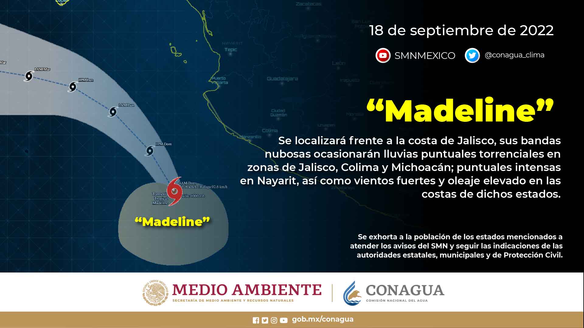 CDMX, 18 de septiembre del 2022.- Este día domingo, la tormenta tropical “Madeline” se localizará frente a la costa de Jalisco, sus bandas nubosas ocasionarán lluvias puntuales torrenciales en zonas de Jalisco, Colima y Michoacán; puntuales intensas en Nayarit, así como vientos fuertes y oleaje elevado en las costas de dichos estados.