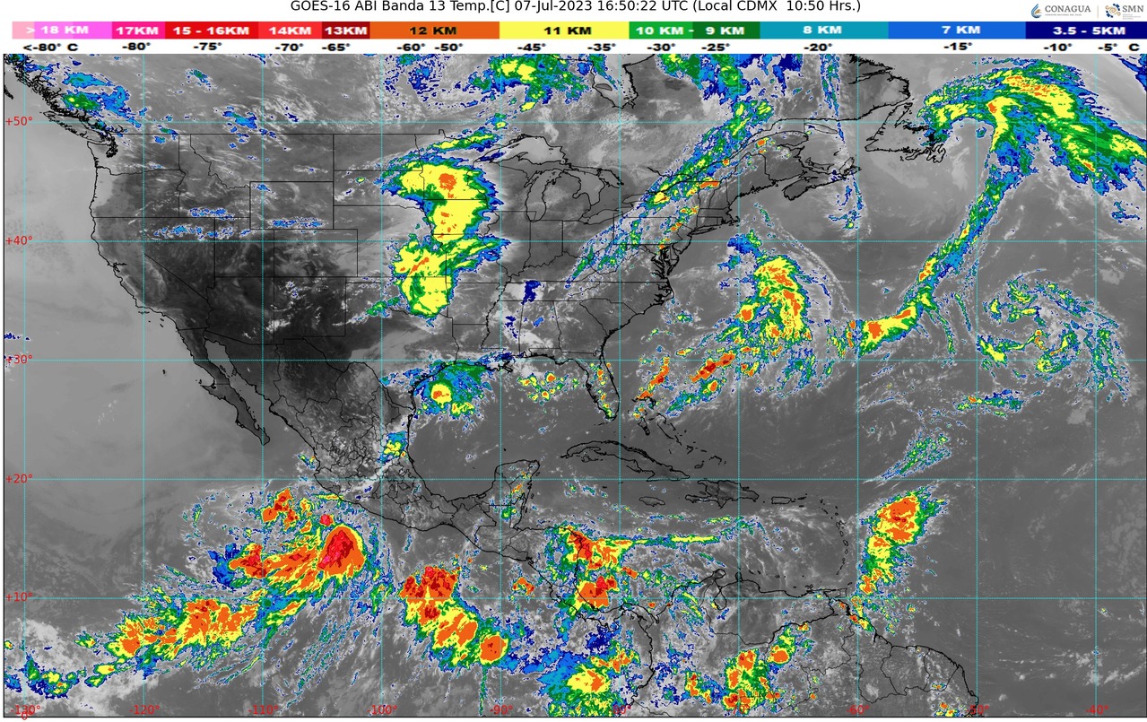 CDMX, 07 de julio del 2023.- Durante este día viernes, la zona de baja presión con alta probabilidad para desarrollo ciclónico en interacción con la onda tropical Núm. 10, se desarrollará a un posible ciclón tropical al suroeste de las costas de Jalisco. Su circulación ocasionará lluvias muy fuertes con puntuales intensas en Nayarit, Jalisco, Colima y Michoacán, dichas precipitaciones podrán estar acompañadas de descargas eléctricas y posible caída de granizo; además se prevén fuertes rachas de viento y oleaje elevado en costas de dichas entidades.