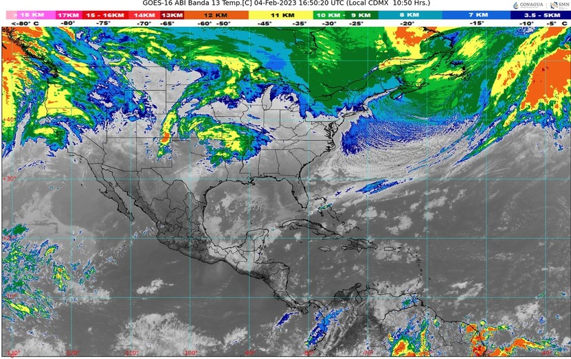 CDMX, 04 de febrero del 2023.- Hoy sábado el frente Núm. 28 sobre el sureste del país y la Península de Yucatán, ocasionará lluvias muy fuertes en Tabasco, Campeche, Yucatán y Quintana Roo y puntuales intensas en zonas de Chiapas. La masa de aire frío asociada al sistema frontal, mantendrá evento de “Norte” intenso en el Istmo y Golfo de Tehuantepec y moderado en el litoral de Veracruz, Tabasco, Campeche y Yucatán.