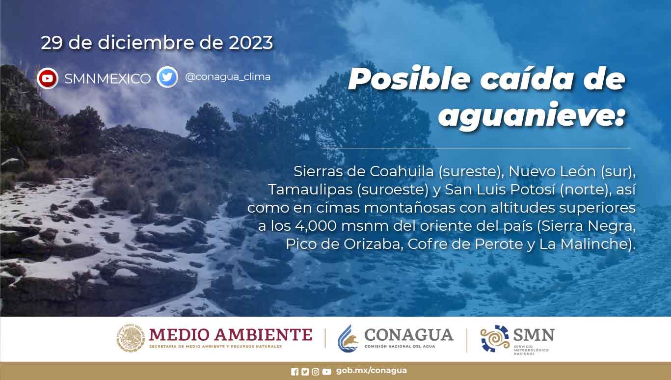 Posiblecaída de aguanieve: sierras de Coahuila (sureste), Nuevo León (sur), Tamaulipas (suroeste) y San Luis Potosí (norte), así como en cimas montañosas con altitudes superiores a los 4,000 msnm del oriente del país (Sierra Negra, Pico de Orizaba, Cofre de Perote y La Malinche).
