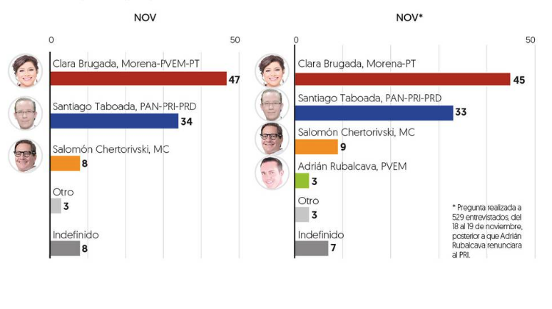 Luego de la definición de candidatos de Morena, las opiniones favorables de Clara Brugada casi no se movieron; pasaron de 43 a 44 por ciento, entre octubre y noviembre. En cambio, la opinión positiva de Omar García Harfuch bajó, luego de no ser seleccionado. De 46 a 40 por ciento, en el mismo lapso.