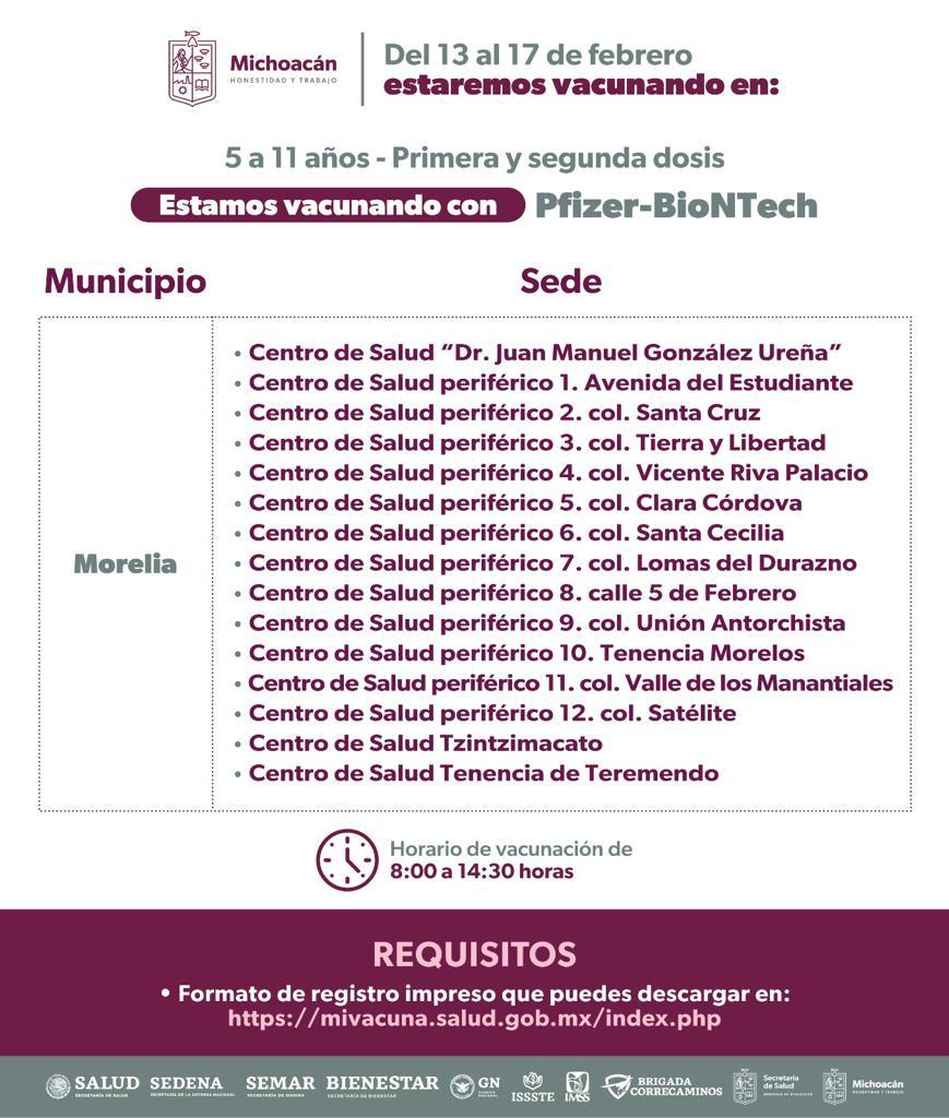 Morelia, Michoacán, 17 de febrero del 2023.- La Secretaría de Salud de Michoacán (SSM) recuerda a la población que los 15 centros de salud que hay Morelia continúan con la vacunación contra el COVID-19 de 8:00 a 14:30 horas.