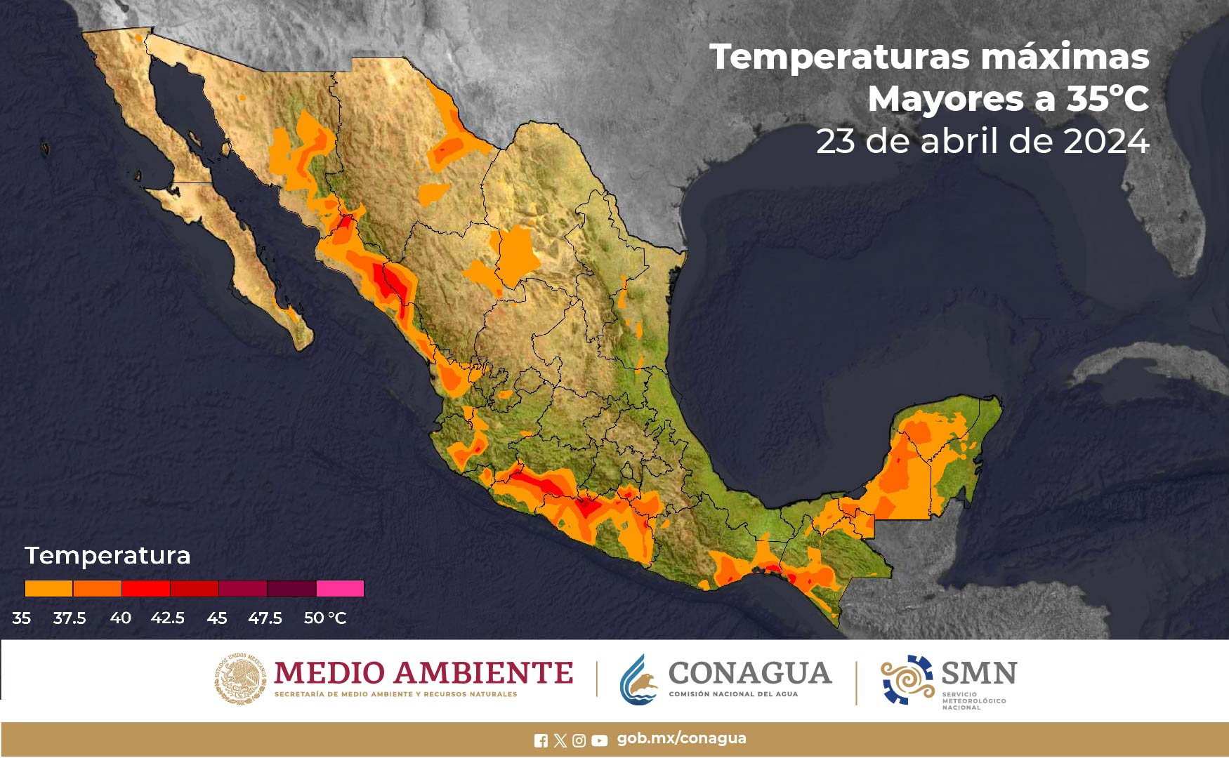 Temperaturas máximas de 35 a 40 °C: Baja California, Baja California Sur, Sonora, Chihuahua, Coahuila, Nuevo León, Tamaulipas, San Luis Potosí, Zacatecas, Durango, Aguascalientes, Guanajuato, Estado de México (suroeste), Puebla (suroeste) y Quintana Roo.