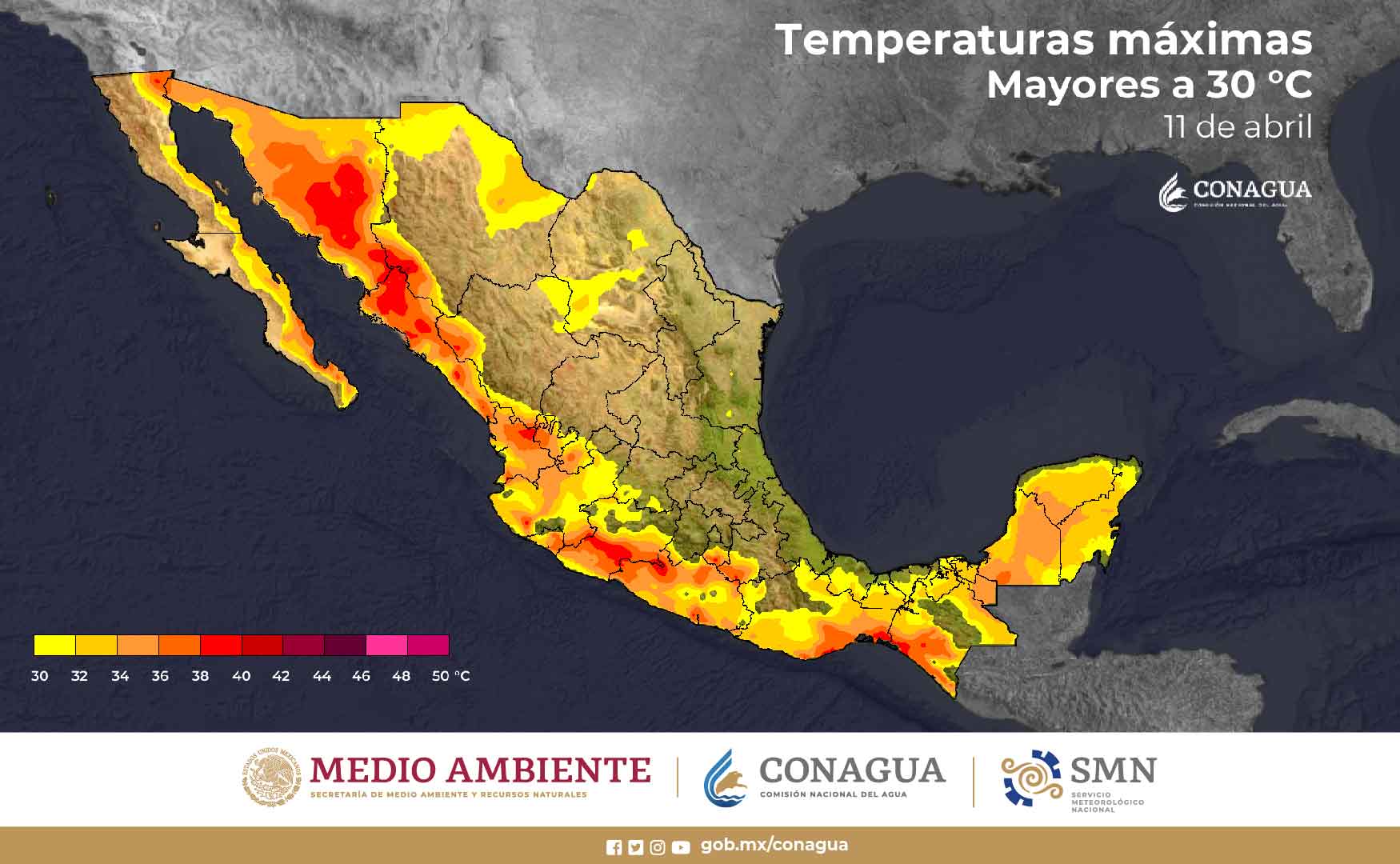 Las temperaturas máximas (en °C) se registraron en:Choix, Sin., 40.8; Hermosillo, Son., 40.5; Zacatepec, Mor., 38.4; Ejido Nuevo León, B.C., 37.9; Arriaga, Chis., 37.1; Salina Cruz, Oax., 36.1, Valladolid, Yuc., 35.5; Tepic, Nay., 34.6; Acapulco, Gro., 34.5 y Observatorio Central de Tacubaya, CdMx, 24.5.