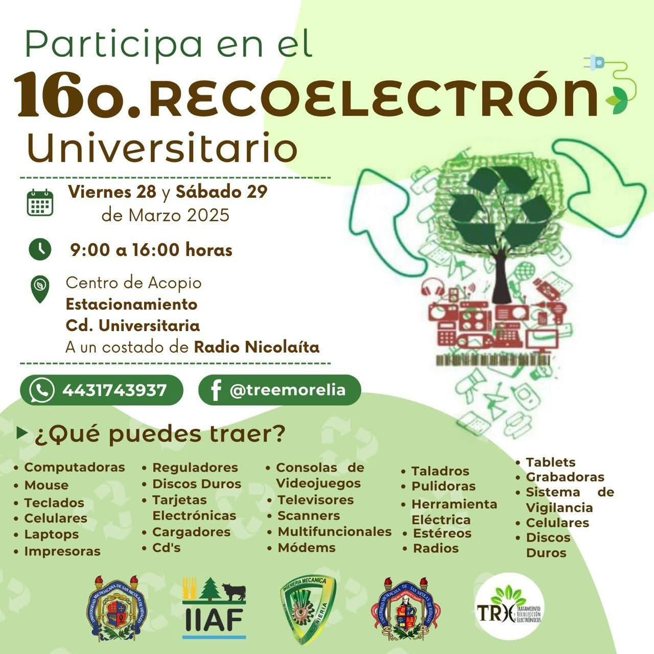 Morelia, Michoacán, a 23 de marzo de 2025.- La Universidad Michoacana de San Nicolás de Hidalgo (UMSNH) invita a la población en general a participar en el 16° Recoelectrón Universitario, que se llevará a cabo el próximo 28 y 29 de marzo.