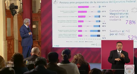 Durante su conferencia de prensa y sin mediar pregunta de por medio, el mandatario abordó la encuesta y detalló cada uno de los resultados que respaldan en gran medida buena parte de su propuesta de reforma electoral: destinar menos recursos a partidos políticos, arrojó un 93 por ciento a favor o muy a favor; reducir el número de diputados y senadores plurinominales fue respaldado por el 87 por ciento (a favor o muy a favor); reducir el presupuesto del INE 74 por ciento a favor o muy a favor.