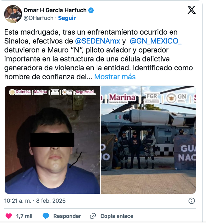 El secretario de Seguridad Pública y Ciudadana, Omar García Harfuch, señaló que Mauro “N” es piloto aviador y operador importante en la estructura de una célula delictiva generadora de violencia en la entidad.