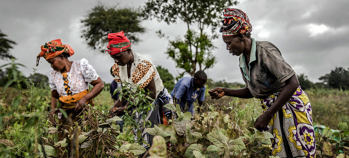 © FAO/Luis TatoAgricultoras cosechan frijoles en Kenia.