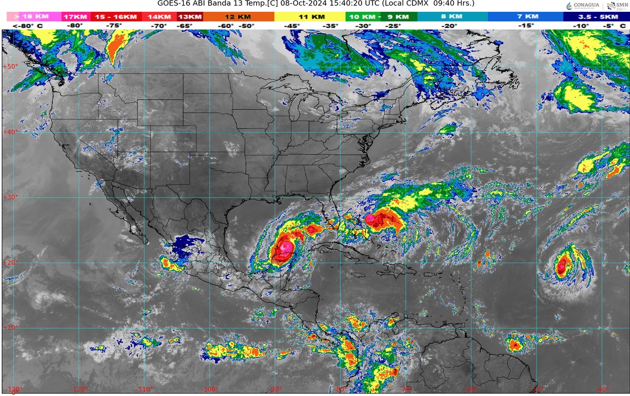 CDMX, 08 de octubre del 2024.- Durante este día, Milton continuará desplazándose sobre el golfo de México como huracán de categoría 4 en la escala Saffir-Simpson, muy cerca de la costa de Yucatán, su amplia circulación originará lluvias intensas en Yucatán y Quintana Roo, muy fuertes en Campeche, y fuertes en Veracruz y Tabasco, así como rachas de viento de 180 a 200 km/h, oleaje de 6 a 8 metros de altura y posible formación de trombas marinas en las costas de Yucatán y Quintana Roo (norte), con rachas de 120 a 150 km/h, oleaje de 4 a 6 metros de altura y posible formación de trombas marinas en las costas de Campeche (norte), y con rachas de 60 a 80 km/h y oleaje de 1 a 3 metros de altura en las costas de Veracruz y Tabasco.