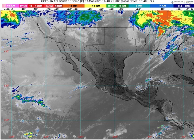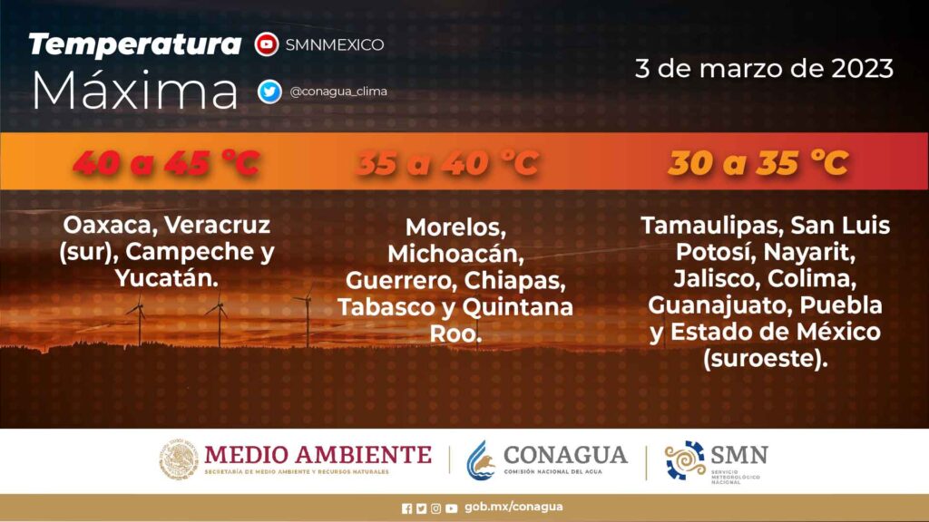 Finalmente, un sistema anticiclónico en niveles medios de la atmósfera mantendrá durante la tarde ambiente cálido a caluroso en el occidente, centro y Península de Yucatán, previéndose temperaturas máximas con valores de 40 a 45 °C en zonas de Morelos, Guerrero, Oaxaca, Veracruz (sur), Campeche y Yucatán.Pronóstico de lluvias para hoy 03 de marzo de 2023: