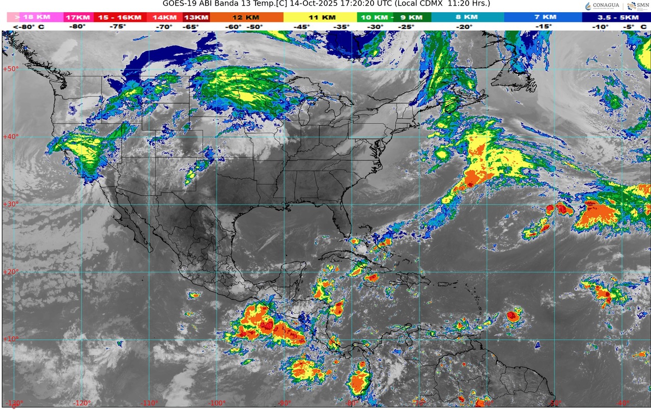 CDMX, 14 de octubre del 2025.- Este día martes, canales de baja presión sobre el occidente del golfo de México, el sureste mexicano y la península de Yucatán, en interacción con una circulación ciclónica en niveles altos que desplazará sobre el sur de dicho golfo y con una zona de baja presión con probabilidad para desarrollo ciclónico en el Pacífico Sur Mexicano, originarán lluvias puntuales intensas en Chiapas; puntuales muy fuertes en Tabasco, Veracruz y Oaxaca; y puntuales fuertes en Quintana Roo, Yucatán y Campeche.