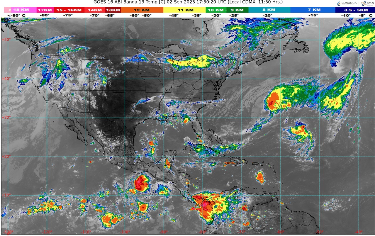 CDMX, 02 de septiembre del 2023.- Este día sábado, el monzón mexicano, canales de baja presión en el interior de la República Mexicana y el ingreso de humedad de ambos litorales, aunado al avance de la onda tropical Núm. 25 al sur de la Península de Yucatán y gradualmente sobre el sureste mexicano, producirán lluvias muy fuertes a puntuales intensas en Veracruz (sur), Tabasco, Oaxaca y Chiapas; lluvias fuertes en Sonora, Chihuahua, Nayarit, Jalisco, Colima, Michoacán, Guerrero, Estado de México, Morelos, Puebla, Campeche, Yucatán y Quintana Roo, así como lluvias aisladas y chubascos en el noroeste, noreste y centro del país.