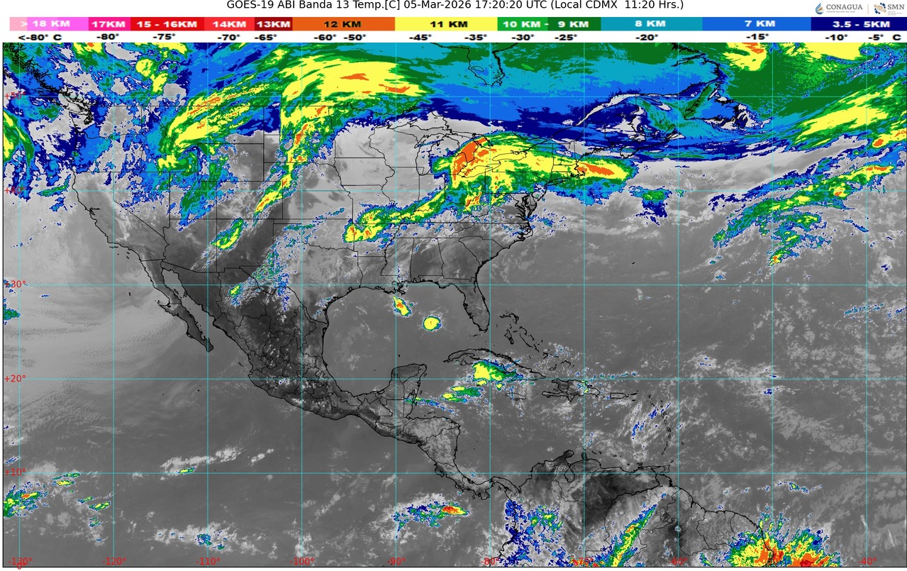 CDMX, 05 de marzo del 2026.- Para hoy jueves, una línea seca sobre el noreste del territorio nacional, ocasionará lluvias puntuales fuertes, descargas eléctricas, posible caída de granizo, además de fuertes rachas de viento en dicha región, con probabilidad de torbellinos en el norte de Coahuila y Nuevo León.