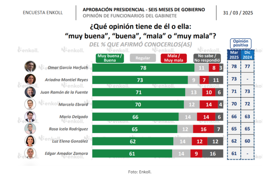 El mejor evaluado es el secretario de Seguridad, Omar García Harfuch, con un 78 por ciento. Le siguen Ariadna Montiel, secretaria del Bienestar, con 73 por ciento; el canciller Juan Ramón de la Fuente, con 71 por ciento; Marcelo Ebrard, titular de Economía, con 70 por ciento, y Mario Delgado, secretario de Educación, con 66 por ciento.