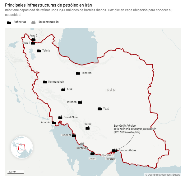 Se calcula que Irán tiene capacidad de refinar unos 2,41 millones de barriles diarios, lo que situaría al país entre los diez primeros productores de petróleo del mundo, pese a las sanciones impuestas por Estados Unidos y la Unión Europea a este producto por sus actividades nucleares desde 2012.