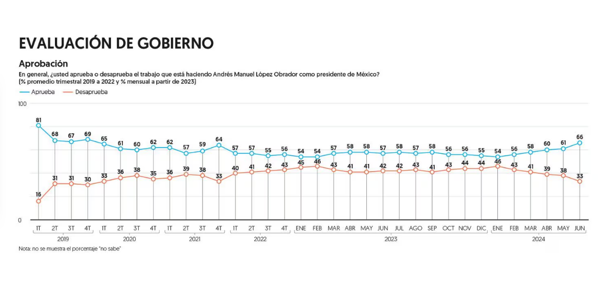 CDMX, 01 de julio del 2024.- El nivel de aprobación ciudadana al presidente López Obrador alcanzó 66 por ciento en junio, después de celebrados los comicios del domingo 2, según revela la más reciente encuesta nacional de El Financiero.