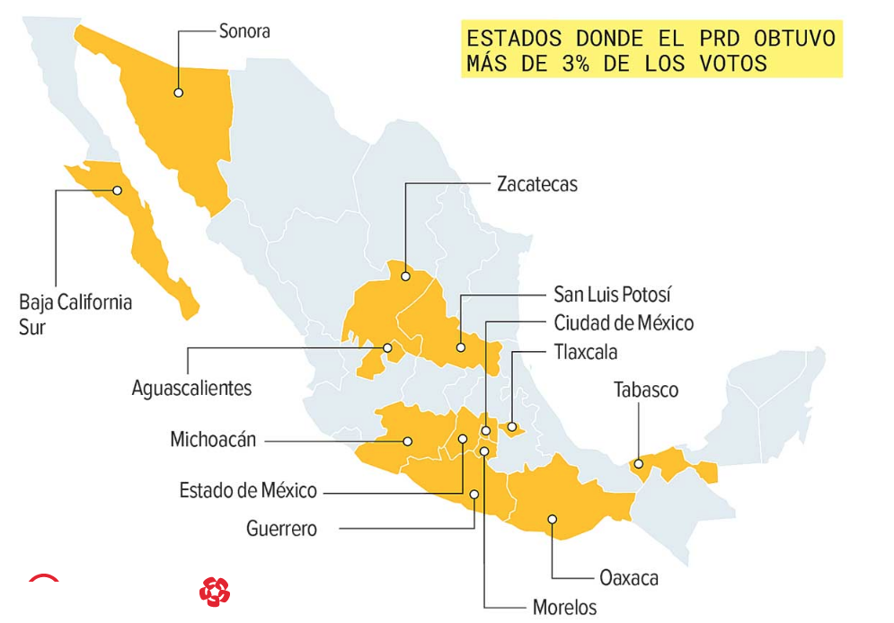 Los estados donde el PRD puede mantener el registro local son Aguascalientes, Baja California Sur, Ciudad de México, Michoacán, Morelos, Estado de México, Oaxaca, Guerrero, Tabasco, Tlaxcala, Zacatecas, Sonora y San Luis Potosí.