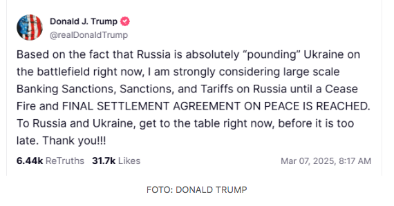 07 de marzo del 2025.- El presidente estadounidense, Donald Trump, amenazó este viernes con “aplicar sanciones bancarias a gran escala”, y aranceles a Rusia hasta que se alcance un alto el fuego y un acuerdo definitivo de paz.