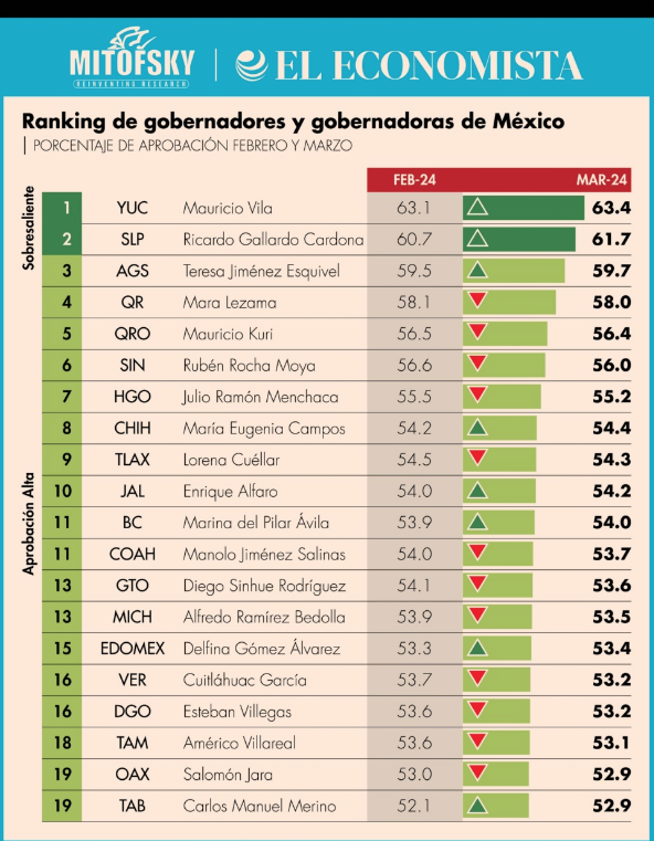 De 32 gobernadores, Mauricio Vila (PAN), de Yucatán, y Ricardo Gallardo Cardona (PVEM), de San Luis Potosí, se colocaron con aprobación “sobresaliente”, con más de 60 por ciento.