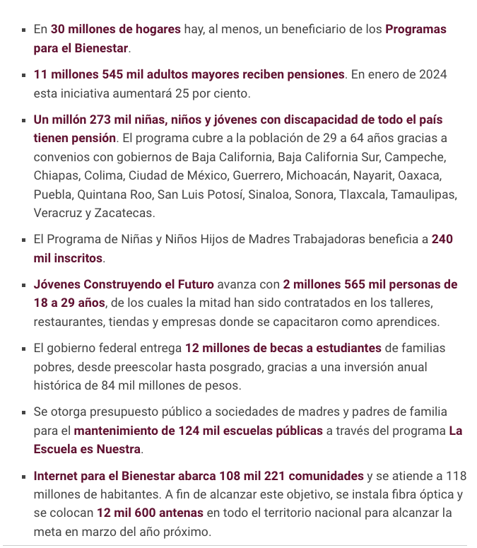 Actualmente llega de manera directa a 30 millones de hogares, cuando menos, un programa de Bienestar o una porción, por pequeña que sea, del presupuesto nacional; y los cinco millones de hogares restantes, que viven en mejores condiciones, también se han beneficiado porque nuestra política económica ha mejorado el poder adquisitivo de las familias y ha fortalecido el mercado interno; se han podido hacer negocios lícitos con ganancias razonables; no se ha aumentado el precio de las gasolinas en términos reales, ni el precio diésel ni del gas –no saben cuánto celebro que un cilindro de gas de los que más consumen los pobres, de 20 kilos, cuesta alrededor de ahora 400 pesos, eso no se veía– tampoco en el tiempo que llevamos ha aumentado en término real el precio de la luz ni se han incrementado los impuestos, ni se han creado impuestos nuevos; y algo que es muy valioso, hay justicia y tranquilidad social y se avanza hacia la erradicación de la violencia. Lo vamos a lograr entre todos, ¡me canso, ganso!