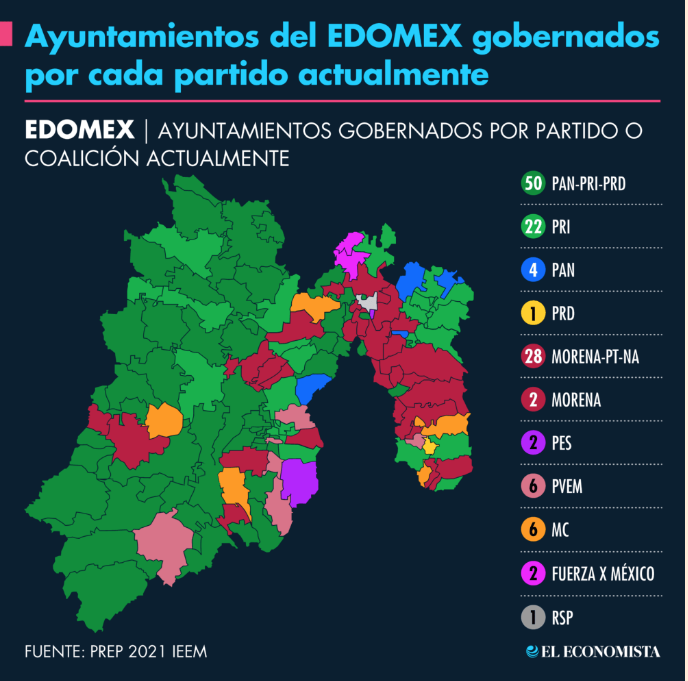 En el Estado de México, actualmente PRI, PAN y PRD gobiernan juntos o por separado 77 municipios; Morena, PT, PVEM y NA (Nueva Alianza), juntos o por separado 38, Movimiento Ciudadano (MC) seis, Redes Sociales Progresistas (RSP) uno y Fuerza por México (FPM) dos.
