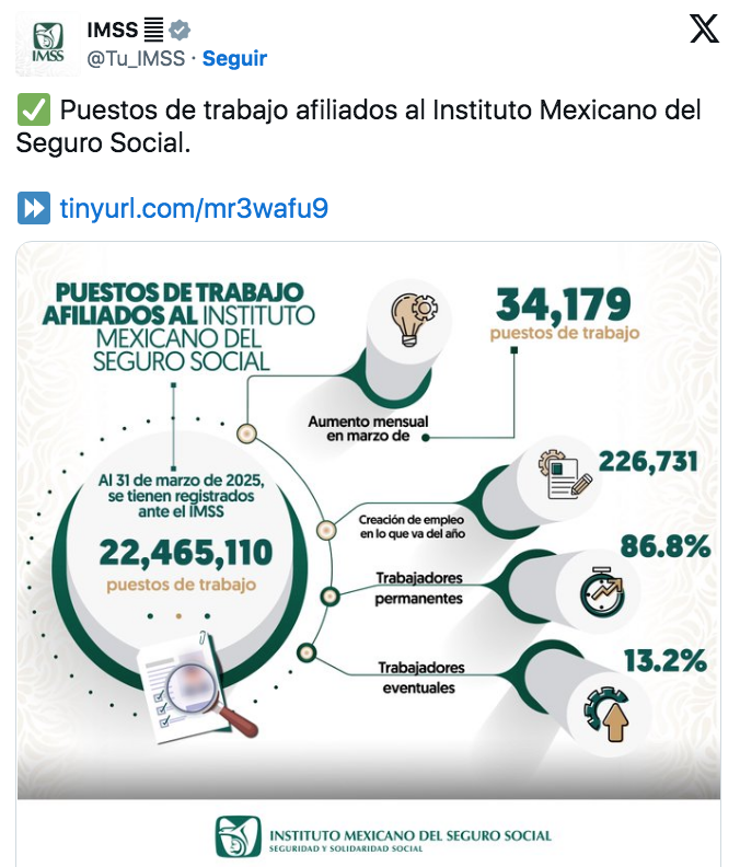 A pesar del repunte durante marzo, la cifra total de empleos formales aún se encuentra por debajo del récord histórico de los 22.6 millones de personas afiliadas al IMSS alcanzado en noviembre de 2024.