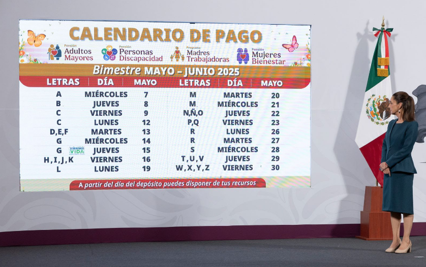 Agregó que del 20 al 30 de mayo, se llevará a cabo la dispersión de las Pensiones y Programas para el Bienestar para las personas cuyo primer apellido inicie con las letras M a la Z.