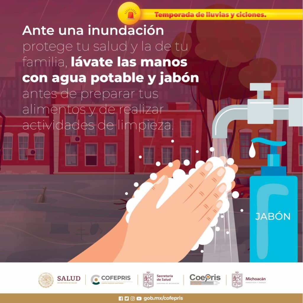 Morelia, Michoacán, 11 de julio de 2023.- Ante la temporada de lluvias y ciclones, la Secretaría de Salud (SSM), a través de la Comisión Estatal para la Protección contra Riesgos Sanitarios (Coepris), exhorta a la población a evitar contraer enfermedades, producto de posibles encharcamientos o inundaciones.