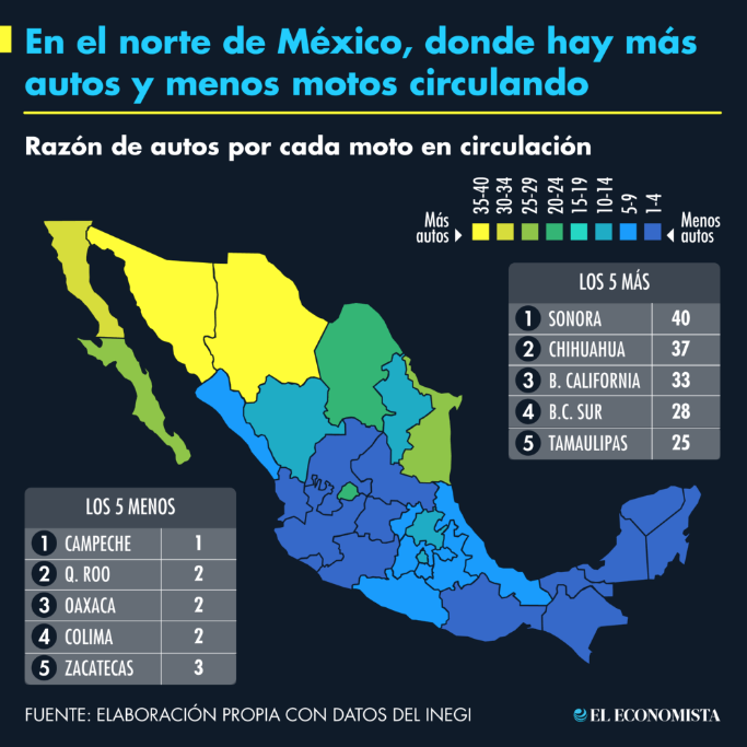 Los niveles del parque vehicular en la Ciudad de México destacan más cuando se comparan con los de otras entidades. Por ejemplo, en Chiapas hay un auto para cada 4.9 habitantes; o en Oaxaca donde hay un auto por cada 3.7 habitantes.