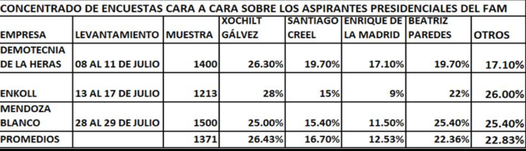 En el Frente Amplio por México, la ventaja que las encuestas revelan que tiene GÁLVEZ RUÍZ sobre sus adversarios no es tan definitiva como en el frente oficialista, son 4,07 puntos de ventaja, estadísticamente pudiéramos decir que hay un empate técnico entre XOCHILT y BEATRIZ PAREDES, de manera que las dos tendrían asegurado el pase a la siguiente etapa, dejando la eliminación entre SANTIAGO CREEL y ENRIQUE DE LA MADRID.