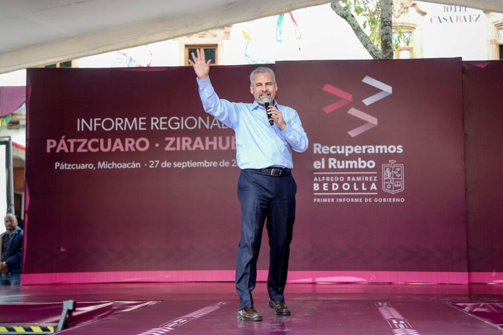 Pátzcuaro, Michoacán, 27 de septiembre del 2022.- Tras ratificar el compromiso con el desarrollo de los municipios y pueblos indígenas, el gobernador Alfredo Ramírez Bedolla, rindió su primer Informe de Gobierno Regional en Pátzcuaro.