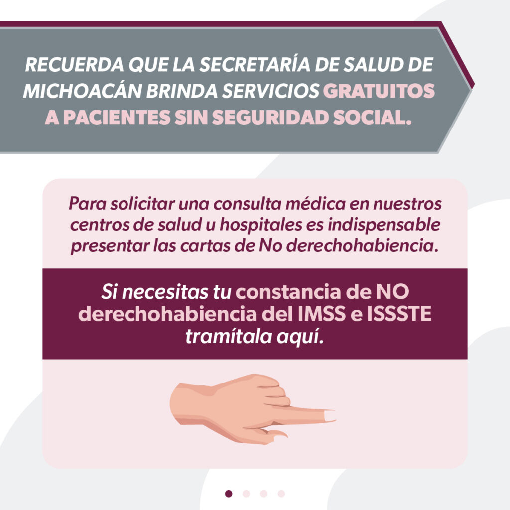 A través de la Secretaría de Salud de Michoacán (SSM), la población sin seguridad social (IMSS o ISSSTE), tiene garantizada la atención médica gratuita y para ello puede acudir a cualquiera de los 364 centro de salud y 27 hospitales que hay en la entidad para ser atendida, conforme al artículo 77 Bis 1 de la Ley General de Salud, que indica el derecho que tienen las y los mexicanos de recibir servicios médicos sin costo.