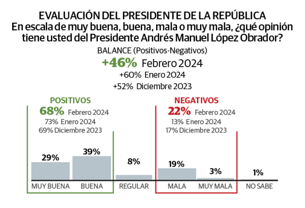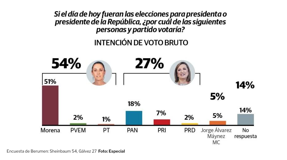 Así lo mostraron los resultados del Estudio Preelectoral a Nivel Nacional para la Presidencia de la República, elaborado por Berumen, con fecha de levantamiento de encuestas entre el 31 de enero y el 7 de febrero del 2024.