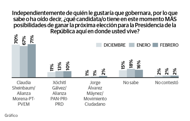A la pregunta “¿qué candidata/o tiene en este momento más posibilidades de ganar la próxima elección para la Presidencia de la República aquí en donde usted vive?”, 71 por ciento respondió en favor de Sheinbaum, con lo que subió cuatro puntos comparado con enero; diez por ciento por Gálvez Ruiz, que bajó tres puntos, y dos por ciento por Álvarez Máynez; 16 por ciento no sabe, y no contestó, dos por ciento.