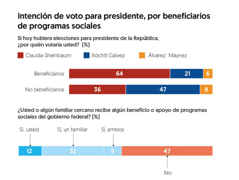 El sondeo indica que las preferencias casi no se movieron en el primer mes de campañas, registrando variaciones de apenas 1 punto porcentual en el apoyo que obtiene cada una de las candidatas y el candidato a la Presidencia respecto del mes anterior. No obstante, el apoyo que las candidatas punteras captan entre la población que recibe apoyos o beneficios de programas sociales y la que no obtiene esos apoyos denota dos escenarios: entre el electorado beneficiario de programas sociales, Sheinbaum obtiene 64 por ciento de la intención de voto y Gálvez 21 por ciento, una diferencia de 43 puntos.