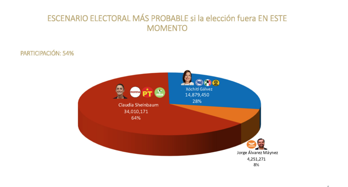 En el estudio de opinión, Sheinbaum, quien abandera la coalición integrada por los partidos Movimiento Regeneración Nacional (Morena), del Trabajo (PT) y Verde Ecologista de México (PVEM), tiene el 64% de las preferencias frente a Gálvez, abanderada de la coalición Fuerza y Corazón por México, integrado por los partidos Revolucionario Institucional (PRI), Acción Nacional (PAN) y de la Revolución Democrática (PRD), quien registró un 28%.