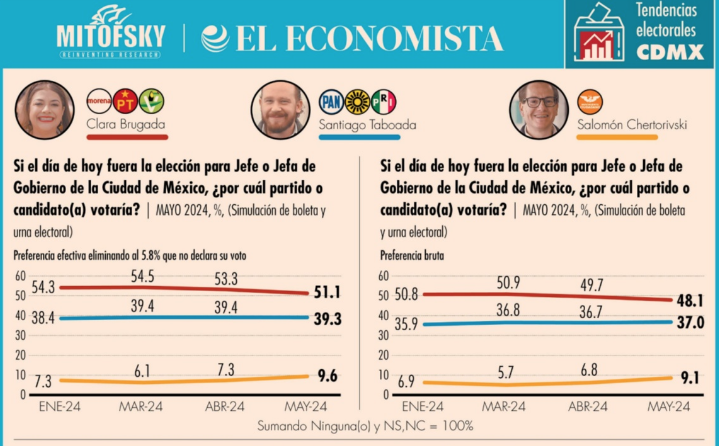 CDMX, 13 de mayo del 2024.- A menos de un mes de las elecciones del próximo 2 de junio, Clara Brugada (51.1%), candidata de Morena, PT y PVEM a la Jefatura de Gobierno de la Ciudad de México, sigue a la cabeza de las preferencias electorales, seguida de Santiago Taboada (39.3%), abanderado del PAN, PRI y PRD; ambos contendientes cayeron 2.2 y 0.1%, respectivamente, comparado con la medición anterior.
