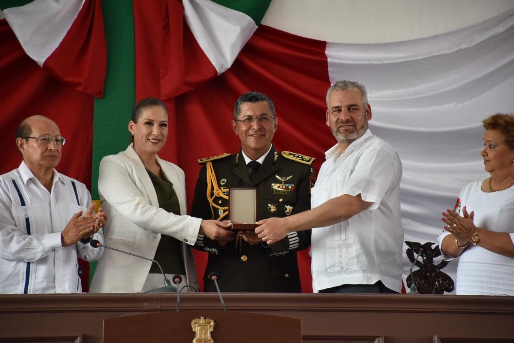 Apatzingán, Michoacán, a 22 de octubre del 2023.- La 75 Legislatura de Michoacán entregó hoy la Presea “Constitución de 1814” al Honorable Heroico Colegio Militar, en el marco de la Sesión Solemne en la que se conmemoró el CCIX Aniversario de la Sanción del Decreto Constitucional para la Libertad de la América Mexicana.