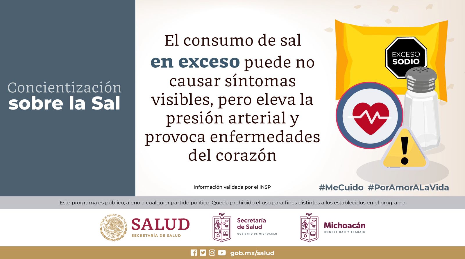Morelia, Michoacán, 31 de julio de 2023.- Problemas cardiovasculares como enfermedad coronaria, hipertensión arterial y accidente cardiovascular; osteoporosis, cálculos renales, cáncer de estómago e incremento de peso corporal, son solo algunos de los padecimientos que puede provocar el consumo en exceso de sal, por lo que la Secretaría de Salud de Michoacán (SSM) exhorta a moderar la ingesta.