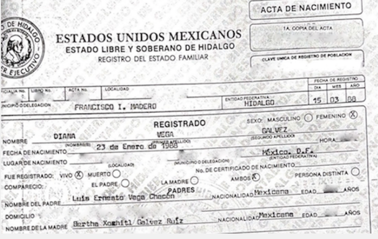 Sin embargo, el relato esconde inconsistencias. Diana Vega Gálvez nació el 23 de enero de 1988, fue registrada el 15 de marzo de ese año por sus dos padres: Vega Chacón y Gálvez Ruiz. Ambos firmaron el documento en el Registro Civil de Tepatepec, Hidalgo.