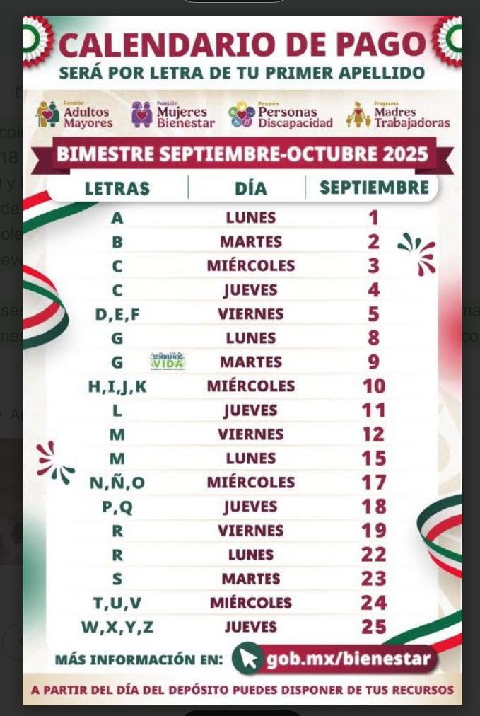 CDMX, 01 de septiembre de 2025.- La secretaria de Bienestar, Ariadna Montiel Reyes, informó que, del 1 al 25 de septiembre, los derechohabientes y beneficiarios de las Pensiones y Programas para el Bienestar de las mujeres, adultos mayores, personas con discapacidad, madres trabajadoras y las y los sembradores, recibirán el pago correspondiente al bimestre septiembre–octubre.