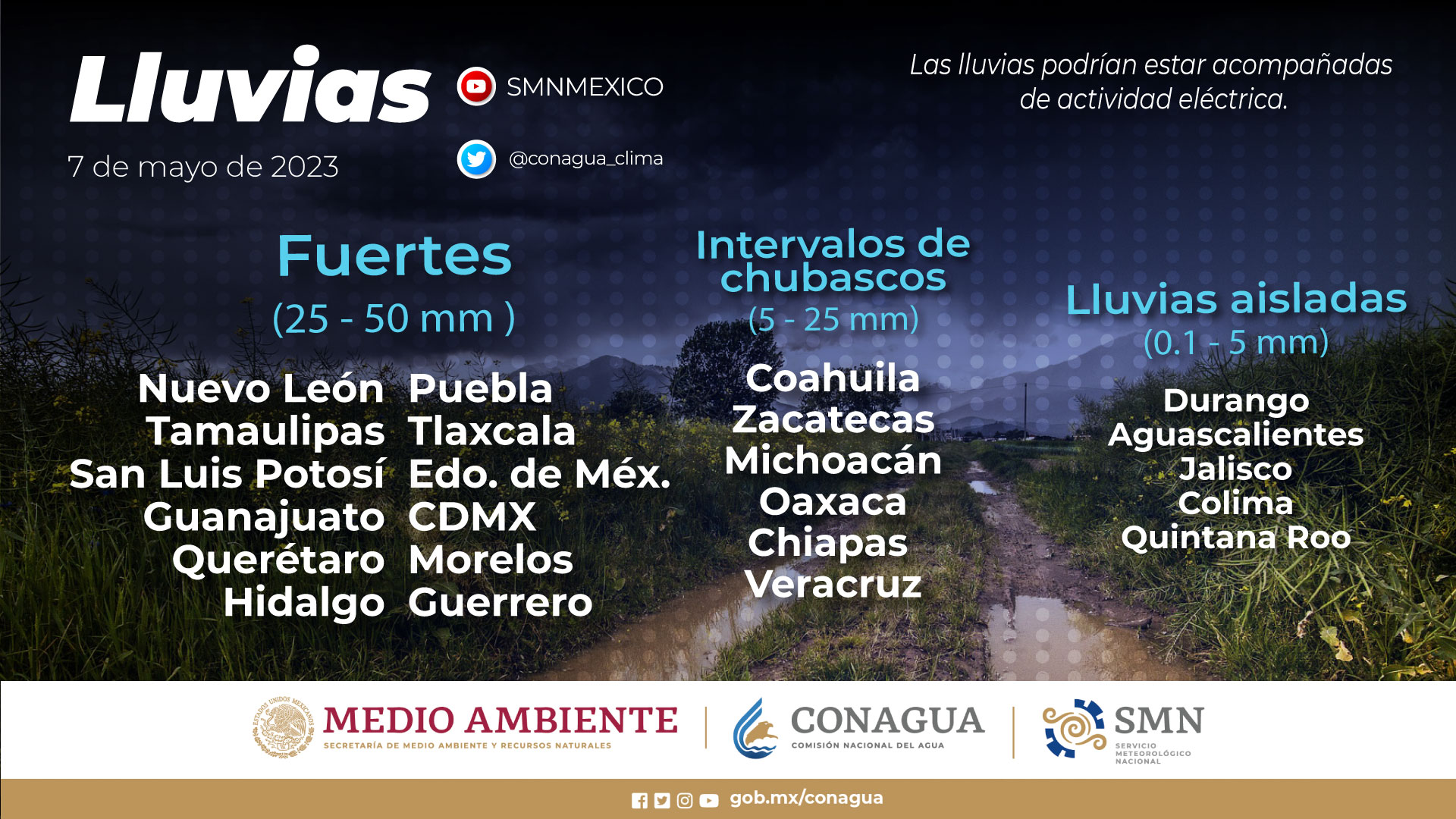 Intervalos de chubascos con lluvias puntuales fuertes (25 a 50 mm): Nuevo León, Tamaulipas, San Luis Potosí, Guanajuato, Querétaro, Hidalgo, Puebla, Tlaxcala, Estado de México, Ciudad de México, Morelos y Guerrero.