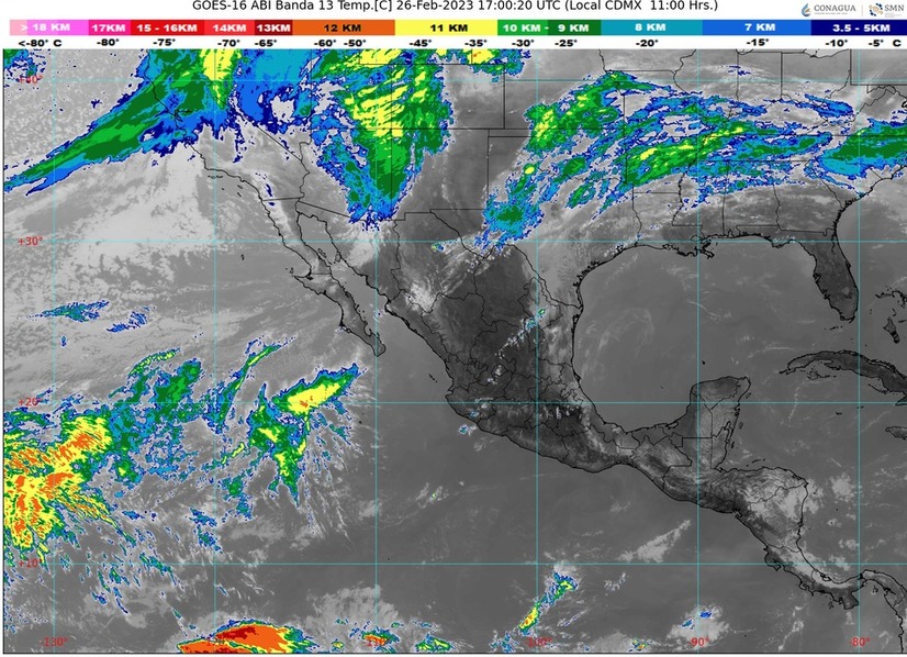 Por la tarde, la Octava Tormenta Invernal se desplazará hacia el noreste, dejando de afectar al país. A su vez, un canal de baja presión se extenderá sobre el sureste mexicano y, en combinación con el ingreso de humedad del Mar Caribe, generará chubascos en Chiapas.