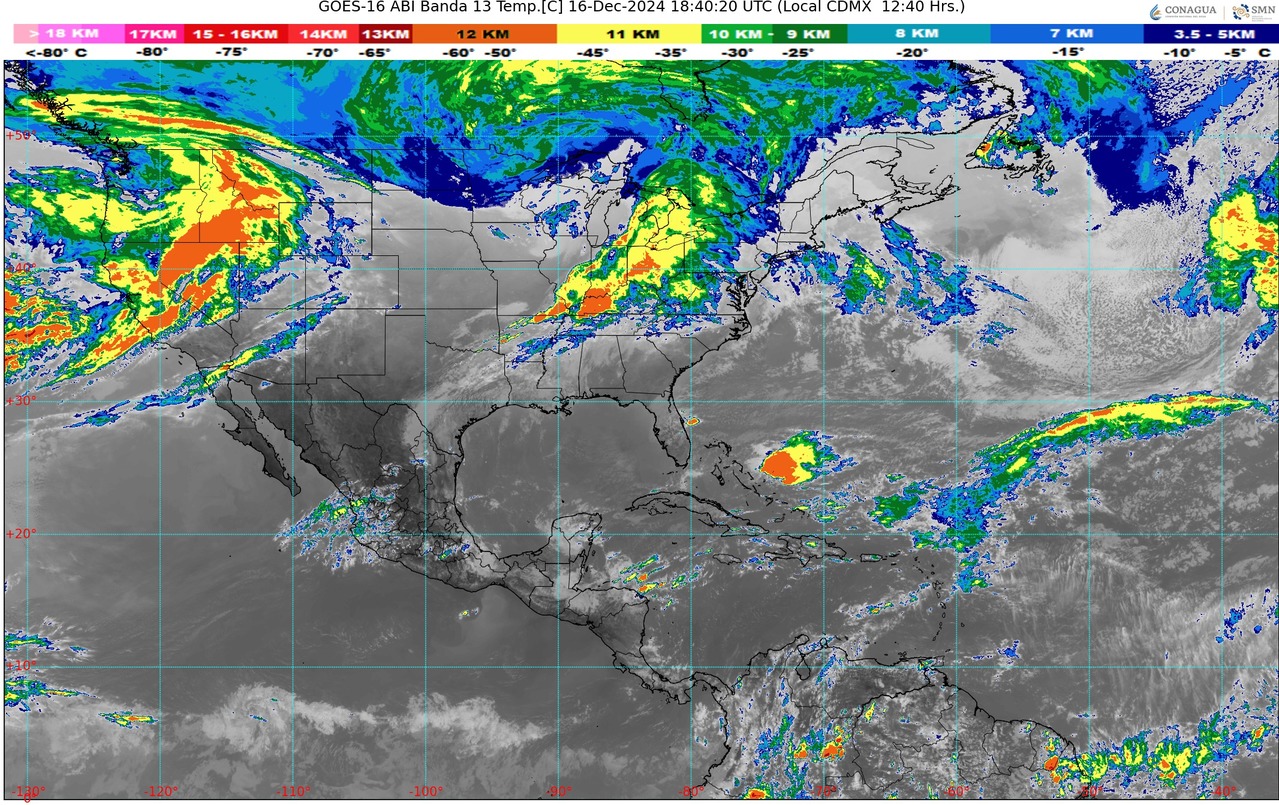 CDMX, 16 de diciembre del 2024.- Para hoy lunes, el frente frío No. 15 sobre el norte de México en interacción con una línea seca en el noreste del país, ocasionarán chubascos con posibles descargas eléctricas y rachas de vientos fuertes con posibles tolvaneras en Coahuila, Nuevo León y Tamaulipas, además de lluvias aisladas en zonas de Chihuahua con rachas de vientos fuertes y posibles tolvaneras en San Luis Potosí.