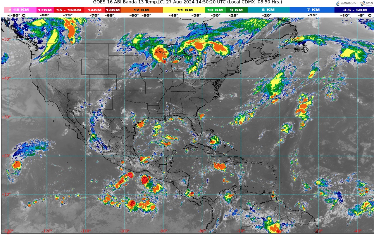 CDMX, 27 de agosto del 2024.- Este día martes, la onda tropical No. 19 recorrerá el sur, centro y occidente del territorio nacional, e interaccionará con inestabilidad en niveles altos de la atmósfera, generando lluvias fuertes a puntuales intensas, descargas eléctricas, rachas de viento y posibles granizadas en las regiones mencionadas.