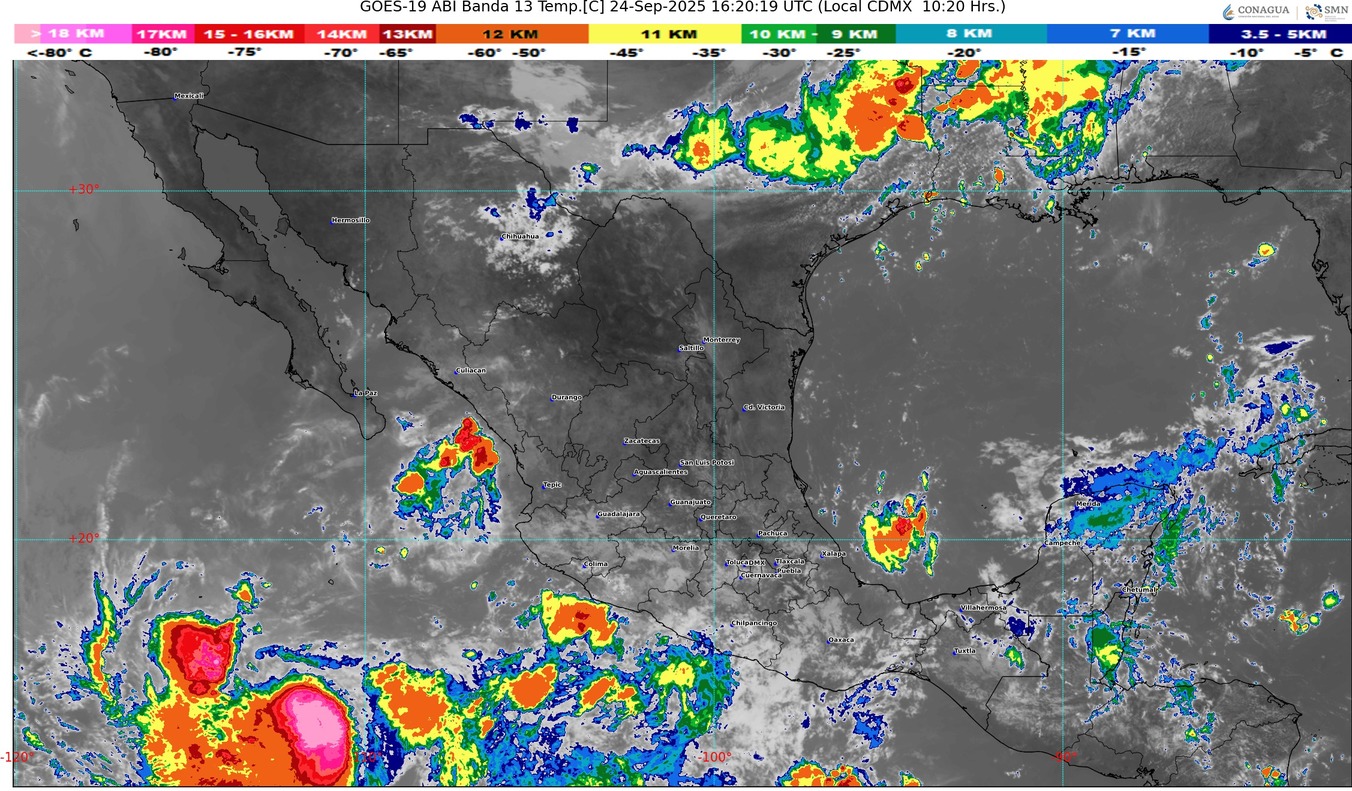 CDMX, 24 de septiembre del 2025.- Para hoy miércoles, el monzón mexicano ocasionará lluvias puntuales intensas en Nayarit; puntuales muy fuertes en Sinaloa; puntuales fuertes en Sonora y Durango; chubascos en Baja California Sur y lluvias aisladas en zonas de Baja California.