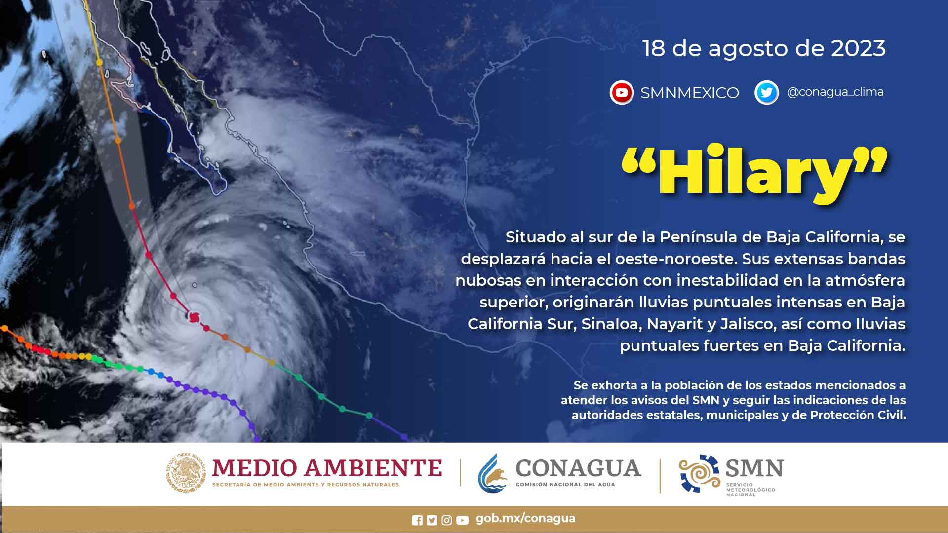 CDMX, 18 de agosto del 2023.- Para hoy viernes, el huracán Hilary situado al sur de la Península de Baja California, se desplazará hacia el oeste-noroeste. Sus extensas bandas nubosas en interacción con inestabilidad en la atmósfera superior, originarán lluvias puntuales intensas en Baja California Sur, Sinaloa, Nayarit y Jalisco, así como lluvias puntuales fuertes en Baja California.